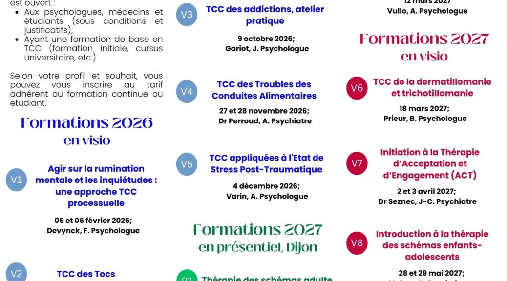 – Rassembler et organiser les professionnels formés aux thérapies comportementales et cognitives (TCC) ou portant un intérêt aux TCC présents en Bourgogne.